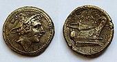 The most common obverse types were a head of Mercury or an acorn, and the most common reverse types were a prow or a caduceus.[1] It was issued until about 210 BC, at about the same time as the denarius was introduced.
