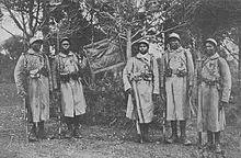 The Senegalese Tirailleurs (French: Tirailleurs Sénégalais) were a corps of colonial infantry in the French Army. They were initially recruited from Senegal, French West Africa and subsequently throughout Western, Central and Eastern Africa: the main sub-Saharan regions of the French colonial empire.[1] The noun tirailleur, which translates variously as "skirmisher", "rifleman", or "sharpshooter", was a designation given by the French Army to indigenous infantry recruited in the various colonies and overseas possessions of the French Empire during the 19th and 20th centuries.[2]