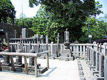 His retainers the forty-seven Rōnin led by Oishi Kuranosuke avenged his death, washed his opponent's head in a water well and presented it on the altar in front of his tomb. Afterwards they were ordered by the Shōgun to commit ritual suicide and were also buried here next to their master. Their story became famous through the Kabuki epic Chūshingura and their graves became a popular site of pilgrimage.