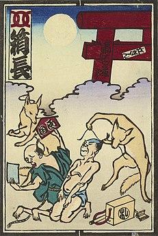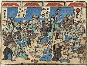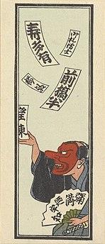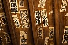 The later style senjafuda are called kokan nosatsu and they originated around Japan's Edo period, 1603 to 1868. They came about because during the beginning of the Edo period, the pilgrimages to shrines gained popularity and started what is known as senjamairi which literally means a thousand shrine visits for good luck. Kokan nosatsu senjafuda are a lot more colorful and have rich patterns and designs. They were used as novelty items and more like trading cards or the business cards of today. Like most all things during the Edo period, they were regulated. Depending on your class and order in society, they could not contain too many colors if you were not upper class. Collectors who enjoyed the many designs and colors of senjafuda would meet to exchange with one another. First the meetings took place at private homes and then later were arranged for public places like restaurants and expensive tea houses. According to Kiritani's Vanishing Japan the oldest surviving invitation card to a senjafuda meeting dates back to 1799.[1] The government found out about the meetings and enforced law upon them. This did not stop the meetings from taking place, and they continue to this day, collectors and aficionados alike meet to share and trade their own designs as well as admire others.