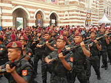 The unit was bestowed the Maroon beret by the British 22 SAS, which is worn proudly by the unit to this day.[11] This beret colour has become synonymous with the group instead of SAS sand-coloured ones because during their formation in 1956, the Malayan Scouts (now 22 SAS) wore maroon berets.[12]