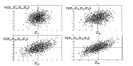 A simple but useful tool is to plot scatter plots of the output variable against individual input variables, after (randomly) sampling the model over its input distributions. The advantage of this approach is that it can also deal with "given data", i.e., a set of arbitrarily-placed data points, and gives a direct visual indication of sensitivity. Quantitative measures can also be drawn, for example by measuring the correlation between Y and Xi, or even by estimating variance-based measures by nonlinear regression.[15]
