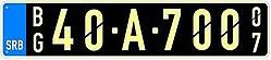 Additionally, plates have vertically orientated two-letter initials in small letters on the left side (after blue stripe) indicating the city in which they were issued (BG for Belgrade) and two numbers on the right side indicating the year for which they are valid (e.g., 12 for 2012).