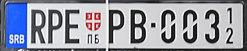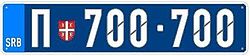 - Police and fire service plates have letter П (P in Cyrillic), Serbian shield, and then six numbers; on a blue background.