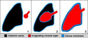 The two layers of serous membranes are named parietal and visceral. Between the two layers is a thin fluid filled space.[2] The fluid is produced by the serous membranes and stays between the two layers to reduce friction between the walls of the cavities and the internal organs when they move with respect to one another, such as when the lungs inflate or the heart beats. Such movement could otherwise lead to inflammation of the organs.[2]