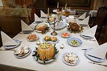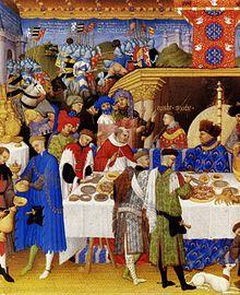 There was supposed, by the cookery books, to be a more or less fixed ratio of around four dishes per diner, all different. Unlike today, when doubling the number of diners from say 12 to 24 will normally mean doubling the quantity prepared of each type of food, service à la française doubled the number of different dishes of all types, to about 96.[9] Therefore, in a large dinner, there was no chance for every diner to taste everything on the table, and two diners at different points around the table might well both have a hearty dinner, without tasting any of the same food, as with a large modern buffet. But whereas in the Middle Ages and Renaissance the best food was placed on the table with the most important diners, or the centre of a very large table, the lesser tables or edges of the main table doing rather less well, now the quality of food was even across the table. But now only diners accepted as more of less of the same status eat in the same room at all.[10]