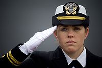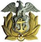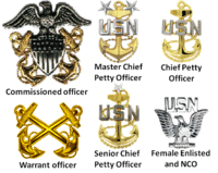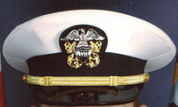 In the United States Navy, midshipmen, chief petty officers, and commissioned officers wear combination covers, but there are differences between the three types. Midshipmen at the United States Naval Academy, United States Merchant Marine Academy or in Naval Reserve Officers Training Corps (NROTC) units wear a combination cap with a gold chinstrap attached by gold buttons, with a gold fouled anchor device. A chief petty officer wears a combination cap with a black chinstrap attached with gold buttons, with a device consisting of a gold fouled anchor with silver block letters "USN" superimposed on the shank of the anchor, with the addition of one, two, or three stars at the top of the anchor if the wearer is a Senior Chief Petty Officer, a Master Chief Petty Officer, or the Master Chief Petty Officer of the Navy, respectively; while a commissioned officer wears a combination cap with a gold chinstrap attached by gold buttons, with an officer crest device, a silver federal shield over two crossed gold fouled anchors, surmounted by a silver eagle. Chief petty officer and junior commissioned officer visors are shiny black plastic without ornamentation. Officers O-5 (Commander) and above have gold embroidered oak leaves and acorns on a black felt-covered visor, with additional embroidery for flag officers (O-7, or rear admiral lower half, and above), referred to as "scrambled eggs." A thin plastic crown and metal hoop provides structure, and the covering fabric come in khaki or in white (since 1963, the white combination cap is worn with both white and blue uniforms). The black band around the cap includes a black circle extending upward on the front of the crown as a backing behind the device. The gold buttons on the sides of the cover that fasten the chin strap are of a design to match the gold buttons on the service dress jacket and the snaps on officer shoulder boards. For the former female cap the brim was folded up on both sides whereas the men's cap has no brim but a visor at the front; the female cap was discontinued October 2018.[16]