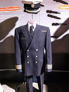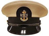 Royal Navy officers were first issued peaked caps in 1825 as a less formal alternative to the bicorne hat. From 1846, it was worn with a crown on the front, and later (from 1856), gold braid was added to the brim to ensure commissioned officers were instantly recognised by their subordinates. Commanders, captains and commodores had one gold wreath on their peaks, whereas flag officers had two. Before the Second World War, naval officers were required to possess two caps: one with a white cover for summer and one without for winter.[12] However, flag officers often preferred the white-topped cap in order to stand out from their subordinates.