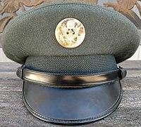After the Second World War, both the West German Bundeswehr and East German National People's Army continued to be issued uniforms derived from the Second World War pattern. East German caps bore the DDR State Cockade with the Hammer and Compass design, while West German caps had a cockade in the German national colours, and a badge featuring a pair of crossed swords. After reunification, the Schirmmütze remained part of the German army dress uniform.[9]