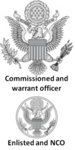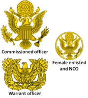 In the United States Army soldiers of ranks Specialist and below are not authorized to wear a combination cap and may only wear a beret with the blue service uniform. The combination cap for the blue service and blue dress uniforms of noncommissioned officers (Corporal and above) has a golden stripe on top of the cap band, black chinstrap; the device is the United States' coat of arms in front of a gold disk (the exception is the Sergeant Major of the Army whose device is a gold-colored rendering of the U.S coat of arms surrounded by a gold-coloured wreath). The version for warrant officers and company-grade officers (second lieutenants, first lieutenants, & captains) has a cap band with the branch-of-service color between two golden stripes, and a gold-colored chinstrap. Field-grade officers O-4 and Above (major, lieutenant colonel, and colonel) have oak leaves known unofficially as "scrambled eggs" on the visor. General officers' caps are similar to those of field-grade officers, but the cap band is dark blue and embroidered with gold oak leaf motifs. Warrant officers' cap device and all commissioned officers' cap device is a gold-color rendering of the United States' coat of arms, larger than that of soldiers and lacking the golden disk backing.