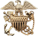 While the majority of American merchant mariners are employed by shipping businesses and accordingly wear either uniforms prescribed by their employers or civilian attire, some officers receive commissions in the United States Maritime Service for federal government duty, such as the faculty of the United States Merchant Marine Academy and the Military Sealift Command's civilian officers manning non-commissioned United States Naval Ships. These officers wear uniforms and rank insignia adopted from the U.S. Navy, albeit with United States Merchant Marine's own button design, cap device, awards, and decorations. The combination covers these officers are identical to those of naval officer with respect to colors, chinstrap and peak ornamentation. The buttons securing the chin strap to the sides of the band are smaller versions of the buttons worn on their coats. The USMS cap device is a rendering of the Merchant Marine device in gold- and silver-colored metal. Like the device worn by naval officers, it features a silver eagle, with wings outstretched, above a gold shield; the shield, however, is defaced with an anchor and surrounded by a wreath.