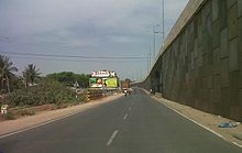 In India, frontage roads or Service lanes (sometimes called नल्ला "Nullah" in Hindi) exist on most high density dual carriageway roads and dual carriageway highways. On Access controlled Expressways like the Yamuna Expressway, the frontage roads remain separate from the main carriageway throughout the road's length. Retrofitted and previously non-access controlled roads, such as most National Highways, only have service lanes on stretches where fly-overs (overpasses) are built over junctions or through towns.