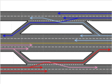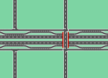 Michigan left hand turns are also quite common at surface street-frontage road intersections, with dedicated turnaround lanes (similar to the Texas U-turn) built over the freeway on separate bridges approximately 100 meters from the main intersection and bridging.[3]