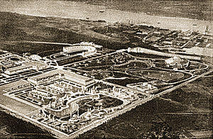 From its opening day on May 31, the exposition already faced challenges to its success. The fair opened with a heavy downpour of rain, causing many fair goers to leave. However, one man, Jacob J. Henderson had been proud to be the first person to enter the fairgrounds at the 9:00 A.M. opening. He stated that he had been to the Centennial with his parents, and did not want to miss opening day of the Sesqui. Within the first hour, it is believed that less than 250 entered the gates of the fairgrounds.[2] The fair drew a much smaller crowd than anticipated (about 10 million people). Variety dubbed it "America's Greatest Flop" with a loss of $20 million by August 1926.[14] The exposition ended up unable to cover its debts and was placed into receivership in 1927, at which point its assets were sold at auction.[15]