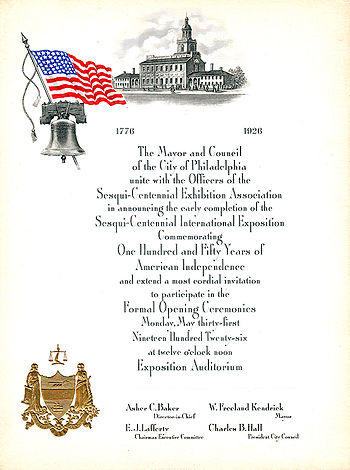 - ^ "Sesquicentennial opens as sun shines; 100,000 pass gates". New York Times. 1926-06-01. p. 1.