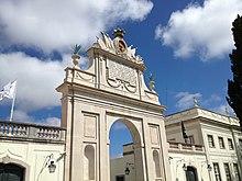 The old and the new wings were connected in 1802 by a neoclassical arch, built in honour of Prince regent John VI and Princess Carlota Joaquina, who visited the palace in that year. The monumental arch, decorated with the bronze effigies of the royal pair and a commemorative Latin inscription, is attributed to architect Francisco Leal Garcia.