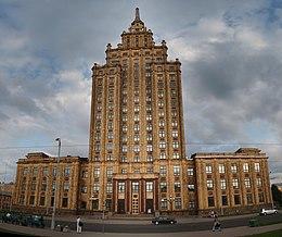 Initially planned as House of Kolkhoz workers (Kolhoznieku nams), construction was started in 1951 and finished in 1958, although the building was officially opened only in 1961. Upon finishing the building was turned over to the Latvian Academy of Sciences. It has 21 floors and a conference hall that seats 1,000 people.[20]