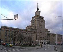 The largest Stalinist architecture building in Prague, Czech Republic. The building was built between 1952 and 1954 at the order of Defence minister Alexej Čepička. It is 88 m high (the roof is 67 m, plus a 10 m chalice and a 1.5 m red star) and has sixteen floors. Part of the building was a fallout shelter for 600 people, currently used as a staff clothes room.