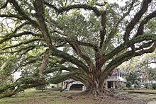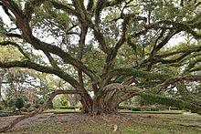 Seven Sisters Oak, located in Mandeville, Louisiana, is a notably large southern live oak in Louisiana.[1] The tree was originally registered at the Live Oak Society as "Doby’s Seven Sisters" (No. 200) because the Doby family owned the property where the tree was located and Mrs. Doby was one of seven sisters.[2] The tree was renamed "Seven Sisters Oak" and reregistered at the Live Oak Society as member number 697.[1] Seven Sisters Oak is the current president of the Live Oak Society,[1] a status awarded to it by being the largest live oak registered by the society. Although there was some controversy as to whether the oak was one tree or several trees that had grown together, an inspection by professional foresters in 1976 determined that the tree developed from a single root system.[2]