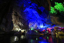 The limestone crags are naturally arranged in the same formation as the seven stars of the Big Dipper constellation. Legend has it that the pillars of limestone grew from stars that fell from the skies. There are a number of caves in this 8 km2 (3.1 sq mi) area and some contain underground rivers that are large enough to navigate by boat. One of the crags can be climbed, having steep stairs going up the side; at the top is a small pavilion for viewing the lake and neighboring crags. Boat tours of the crags and lake can be taken from the area West of Paifang Square. Star Lake has been designated a national park.[1][2]