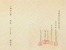 The agreement was signed by Ngapoi Ngawang Jigme, who advocated Tibetan acquiescence to China, and sealed in Beijing on 23 May 1951 and confirmed by the government in Tibet a few months later.[9] In addition, public announcement was made by the Dalai Lama to ratify the agreement, his acceptance was also sent to Beijing in the form of a telegram on 24 October:[10]