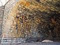 The bridge was proposed in 1883 as part of a group of improvements along Seventh Street, linking downtown St. Paul with the Dayton's Bluff neighborhood on the east. Other parts of this project included a 300-foot iron bridge crossing the Northern Pacific Railway, a long embankment, and a stone-arch sewer for the crossing of Phalen Creek. These improvements were necessary because the hill on Seventh Street needed to be rebuilt to lessen its steepness, so streetcars could travel between downtown and the Dayton's Bluff neighborhood. The Seventh Street Improvement Arches bridge posed a special engineering challenge because the street crossed the St. Paul and Duluth tracks at a 63-degree angle. The bridge also had to carry sewer and water pipes and match the rest of the profile of the regraded hill, making a substantial amount of fill necessary. This precluded the construction of a bridge with ribbed arches, because this method could not support all the weight of the fill. Truesdell also considered using the classical French method of skewed arch construction, but the amount of skilled stonecutting necessary would have made the cost prohibitive.[2] He turned to the helicoidal or spiral method, introduced by British architect Peter Nicholson in 1828.[3] This method was mathematically rigorous, but since Truesdell studied mathematics as a hobby, he decided to accept the challenge. The voussoir stones were cut with curved surfaces to form a series of parallel spiral courses. The initial calculation of the curves was difficult, but once the calculation was performed, all of the voussoirs (except for the ring stones) could be cut from the same pattern. This required the stonecutters to work with more precision than they were used to, but a skilled foreman helped to organize the work.[2] The abutments, piers, and wing walls were built with a variety of gray limestone locally quarried in St. Paul, while the voussoirs, ring stones, coping and spandrel walls were built with a buff-colored limestone quarried in Kasota, Minnesota.[4]