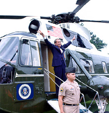 Nixon displays the V-for-victory sign as he departs the White House after resigning