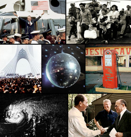 Clockwise from top left: U.S. President Richard Nixon doing the V for Victory sign after his resignation from office following the Watergate scandal in 1974; refugees aboard a US naval boat after the Fall of Saigon, leading to the end of the Vietnam War in 1975; the 1973 oil crisis puts the nation of America in gridlock and causes economic damage throughout the developed world; both the leaders of Israel and Egypt shake hands after the signing of the Camp David Accords in 1978; the 1970 Bhola cyclone kills an estimated 500,000 people in the densely populated Ganges Delta region of East Pakistan (which would become independent as Bangladesh in 1971) in November 1970, and is the second deadliest natural disaster in history; the Iranian Revolution of 1979 ousts Mohammad Reza Pahlavi who is later replaced by an Islamic theocracy led by Ayatollah Khomeini; the popularity of the disco music genre peaks during the mid-to-late 1970s.