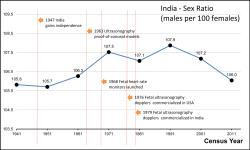 For India, the United Nations FPA claims a birth sex ratio of 111 over 2008–10 period,[45] while The World Bank and India's official 2011 Census reports a birth sex ratio of 108.[46][47] These variations and data reliability is important as a rise from 108 to 109 for India, or 117 to 118 for China, each with large populations, represent a possible sex-selective abortion of about 100,000 girls.