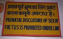 Prenatal sex determination is restricted in many countries, and so is the communication of the sex of the fetus to the pregnant woman or her family, in order to prevent sex selective abortion. In India, prenatal sex determination is regulated under the Pre-conception and Prenatal Diagnostic Techniques (Prohibition of Sex Selection) Act 1994.[52]