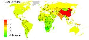 The natural human sex ratio at birth was estimated, in a 2002 study, to be close to 106 boys to 100 girls.[12] Human sex ratio at birth that is significantly different from 106 is often assumed to be correlated to the prevalence and scale of sex-selective abortion. Countries considered to have significant practices of sex-selective abortion are those with birth sex ratios of 108 and above (selective abortion of females), and 102 and below (selective abortion of males).[8] This assumption is controversial, and the subject of continuing scientific studies.