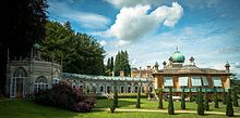 Sezincote House (pronounced seas in coat) is the centre of a country estate in Gloucestershire, England. The house was designed by Samuel Pepys Cockerell, built in 1805, and is a notable example of Neo-Mughal architecture, a 19th-century reinterpretation of 16th and 17th-century architecture from the Mughal Empire.[1] At the time of its construction, British India was becoming the "jewel in the crown" of the world's largest empire.