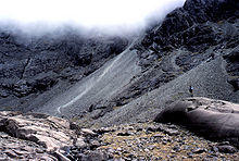 Sgùrr Alasdair is the highest peak of the Black Cuillin, and the highest peak on the Isle of Skye and in the Inner Hebrides, at 992 m (3,255 ft). Like the rest of the range it is composed of gabbro, a rock with excellent grip for mountaineering. It is named after Alexander Nicolson, who made the first recorded ascent in 1873.[2] Prior to this the mountain had been locally known as Sgurr Biorach.[3]