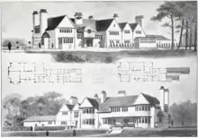Norney Grange, designed by Charles Voysey,[19] is the highest architecturally graded listed building in the Norney part of the parish, a rectangular late 1897-1903 built, roughcast stone home with yellow limestone dressings. Its interior is just as remarkable as its exterior, with among many carved features, a green marble chimney breast in end room to left and a half-dome ceiling with gallery landing to the rear. The house features prominently in the 2021 film The Dig, standing in as Edith Pretty's house at Sutton Hoo, Suffolk.