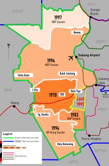 - 1994: Annexed Setia Alam, Bukit Jelutong and Subang Airport from Petaling District Council, and Kota Kemuning and Sg Kandis from Klang Municipal Council; 208.6 km2 annexed