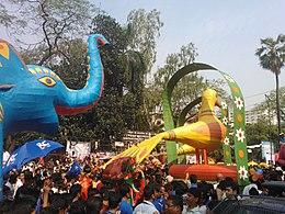Shahbag is also a focal point of the Pohela Baishakh (the Bengali New Year) festival, celebrated every 14 April following the revised Bengali Calendar, and now the biggest carnival in Dhaka.[58][59] From 1965 to 1971 the citizens of Dhaka observed the festival as a day of protest against the Pakistani regime.[60] Other local traditions associated with the festival include the Boishakhi Rally and the Boishakhi Mela begun by the Institute of Fine Arts (now Faculty of Fine Arts) and the Bangla Academy respectively. In addition, Chayanaut Music School began the tradition of singing at dawn under the Ramna Batamul (Ramna Banyan tree). In 2001, a suicide bomber killed 10 people and injured 50 others during the Pohela Baishakh festivals. The Harkat-ul-Jihad-al-Islami, an Islamic militant group, was alleged to be behind the incident.[61]