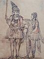 A version of the svasthana has been noted in ancient India which sticks to the calves with narrow circumferences of the lower opening.[27] This is similar to the Punjabi ghuttana which is loose at the thighs and tightens at the knees and ends at the calves (with some versions ending at the knees and the lower legs being naked).[28] This suggests that the use of the suthan is indigenous to the Punjab region. Ultimately, however, the svasthana could have been introduced to ancient India from Central Asia,[29] but its use became popular amongst the general people in the local area during the medieval period,[30] particularly, the 7th century C.E.[25] The wearing of the suthan and kurta continued to be prevalent during the Mughal period between 1526-1748 C.E.[31] and has been in use in unbroken succession since ancient times.[32] The National Review (1925) notes that the suthan was in much use in the Punjab, generally in white washable cloth but on feast days of rich material such as Lahore silk.[33] The svasthana was worn with the tunic called varbana[34] which was tight fitting.