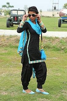 The Punjabi Salwar is part of the Punjabi suit which is the traditional attire of the Punjab region of the Indian subcontinent. It is known for its lively hues, rich fabrics, and embroidery. The suit features three items - a kameez (top), salwar (bottom) and dupatta (scarf). The women's Punjabi salwar suit style has become popular all over the sub-continent and beyond[1][2] reaching even the remote parts of Ladakh.[3] It is also the national dress of Pakistan,[4][5] since the later 1960s with the Punjabi salwar being used in government offices.[6]