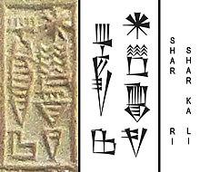 Impression of a cylinder seal of the time of Akkadian King Sharkalisharri, with central inscription: | |