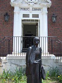 In front of the Sharon Public Library stands a statue of Deborah Sampson, Sharon's town heroine. Sampson disguised herself as a man to fight in the Revolutionary War. After the war, she married Benjamin Gannett, a farmer and lived in Sharon until the end of her life. Sampson began a campaign in 1790 to secure a pension from her time in the Revolutionary War, which earned the support of well known public figures, including Paul Revere. In 1804, Revere visited Sampson (then Sampson Gannett) at her farm in Sharon and wrote to the congressman of her district, William Eustis, that he found her "much more deserving than hundreds to whom Congress have been generous."[2] Sampson was placed on the United States pension list a year later, and awarded an annual payment. She is buried in the local Rockridge Cemetery. A street in Sharon is named Deborah Sampson Street in her honor.