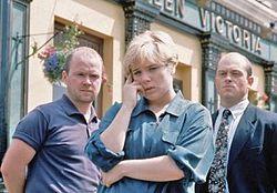 "Sharongate" is the term used for a storyline in the BBC soap opera EastEnders, which reached its climax on 24 October 1994, attracting 25.3 million viewers. The plot was written by EastEnders scriptwriter Tony Jordan.[1] In the storyline, Sharon Mitchell (Letitia Dean) confessed on tape that she had had sex with her husband's brother, Phil (Steve McFadden). The truth comes out in the middle of The Queen Victoria pub. Sharon's husband Grant (Ross Kemp) attacked his brother and Phil was lucky to survive.