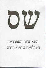 The party was originally called Shom'rei Torah ('Guardians of the Torah'), with the acronym ש״ת, pronounced "Shat" or "Shas." However, Israeli election law requires a party wishing to use letters for their acronym that already appear in the acronym of an existing party to first obtain permission from that party, and the Israeli Labor Party, whose letters are אמת, refused to grant Shas permission to use the ת. Instead, it was named ש״ס, Shas, an acronym for Shomrei S'farad, meaning "Sephardic Guardians".[10][7][11] The name is also a reference to the six orders (Shisha S'darim) of the Mishnah and the Talmud, both of which are often referred to by the same acronym, "Shas." The party's legal name is "Hit'akhdut ha-S'pharadim ha-Olamit Shom'rei Torah" (התאחדות הספרדים העולמית שומרי תורה), meaning "International Union of the Sepharadim, Guardians of the Torah".[12]