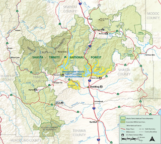 The Shasta–Trinity National Forests are federally designated forests in northern California, United States. Combined, they are the largest National Forest in California and are managed by the U.S. Forest Service. The 2,210,485 acre (894,552 Ha) combined-forest encompasses five wilderness areas, hundreds of mountain lakes and 6,278 miles (10,103 km) of streams and rivers. Major features include Shasta Lake, the largest man-made lake in California and Mount Shasta, elevation 14,179 feet (4,322 m).