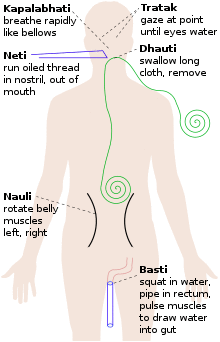 The Shatkarmas (Sanskrit: षटकर्म ṣaṭkarma, literally six actions), also known as Shatkriyas,[2] are a set of Hatha yoga purifications of the body, to prepare for the main work of yoga towards moksha (liberation). These practices, outlined by Svatmarama in the Haṭha Yoga Pradīpikā as kriya, are Netī, Dhautī, Naulī, Basti, Kapālabhātī, and Trāṭaka.[2][3][4] The Haṭha Ratnavali mentions two additional purifications, Cakri and Gajakarani, criticising the Hatha Yoga Pradipika for only describing the other six.[1]