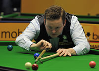 Murphy began the 2012–13 season ranked number six.[139] The first tournament for Murphy was the Wuxi Classic, where he lost in the first round 1–5 against Ken Doherty.[140] Murphy's next tournament was the Six-red World Championship, where he finished first in Group E with four wins out of five matches and advanced to the knock-out stage.[141] There he defeated James Wattana, Barry Hawkins, Dominic Dale and Judd Trump to reach the final, but lost 4–8 against Mark Davis.[142][143] He then reached the quarter-finals of the Australian Goldfields Open, but lost 4–5 against Peter Ebdon.[144] Murphy went one better in the next two ranking tournaments, as he reached the semi-finals of the Shanghai Masters and the International Championship, but lost 3–6 against John Higgins and 5–9 against Neil Robertson respectively.[145][146] Murphy than reached the final of the 2012 UK Championship courtesy of two tight victories. The first against teenager Luca Brecel in the quarter-finals, after Brecel twice had the chance to pot the final pink and black to win the match,[147] then against Ali Carter in which Murphy recovered from 4–8 down and 0–32 in points behind in the deciding frame to win 9–8.[148] He was ultimately defeated by good friend Mark Selby 6–10 in the final.[149] He also participated at the Players Tour Championship, with his best result coming at the third English event, where he reached the semi-finals, but lost 0–4 against Marco Fu.[150] He finished number 29 on the Order of Merit,[151][152] and couldn't qualify to the Finals.[153]