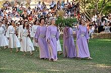 In the largely agrarian society of ancient Israel, Jewish farmers would tie a reed around the first ripening fruits from each of these species in their fields. At the time of harvest, the fruits identified by the reed would be cut and placed in baskets woven of gold and silver. The baskets would then be loaded on oxen whose horns were gilded and laced with garlands of flowers, and who were led in a grand procession to Jerusalem. As the farmer and his entourage passed through cities and towns, they would be accompanied by music and parades.[17]