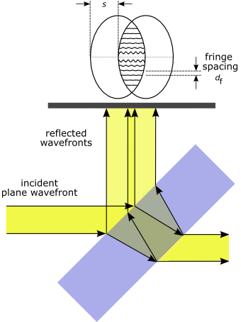 With a plane wavefront incident, the overlap of the two reflected beams shows interference fringes with a spacing of , where is the spacing perpendicular to shear, is the wavelength of the beam, n the refractive index, and the wedge angle. This equation makes the simplification that the distance from the wedged shear plate to the observation plane is small relative to the wavefront radius of curvature at the observation plane. The fringes are equally spaced and will be exactly perpendicular to the wedge orientation and parallel to a usually present wire cursor aligned along the beam axis in the shearing interferometer. The orientation of the fringes varies when the beam is not perfectly collimated. In the case of a noncollimated beam incident on a wedged shear plate, the path difference between the two reflected wavefronts is increased or decreased from the case of perfect collimation depending on the sign of the curvature. The pattern is then rotated and the beam's wavefront radius of curvature can be calculated: , with the shear distance, the fringe distance, the wavelength and the angular deviation of the fringe alignment from that of perfect collimation. If the spacing normal to the fringes is used instead, this equation becomes , where is the fringe spacing normal to the fringes. [1]