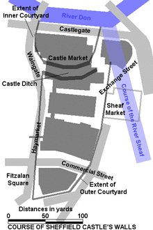 Sheffield Castle was located at the confluence of the River Sheaf and the River Don (53°23′5″N 1°27′48″W / 53.38472°N 1.46333°W), on the western bank of the Sheaf and the southern bank of the Don. The rivers provided defence to the north and east and there was a moat on the south and western sides of the castle.[1] This site was largely covered by Castle Market which was demolished in 2015.