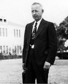 One of Houteff's primary complaints was that the mainstream Seventh-day Adventist Church's institutions were compromising their message and mission by seeking approval and accreditation of the applicable medical and educational boards.[35][36][37] Ironically, some of Houteff's critics issued similar complaints.[38][39] The Davidian organization established institutions of its own, claiming to strictly follow the guidelines of the Adventist church founders.[40][41] Over the next twenty years a children's school, sanitarium, rest home, vocational and home economics school, and other improvements were established on the property.[42] There was also an extensive farming operation with an orchard of approximately 900 trees, dairy cows and a large vegetable garden.[43] The flagship structure was the multi-level administration building, which housed the main office, additional staff offices, chapel, printing equipment and Houteff's sleeping quarters. This building is currently in the possession of Vanguard College Preparatory School.