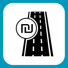 The road sign announcing the entrance to an Israeli toll road, such as Highway 6 or the Carmel Tunnels, is a shekel symbol with a road in the background.